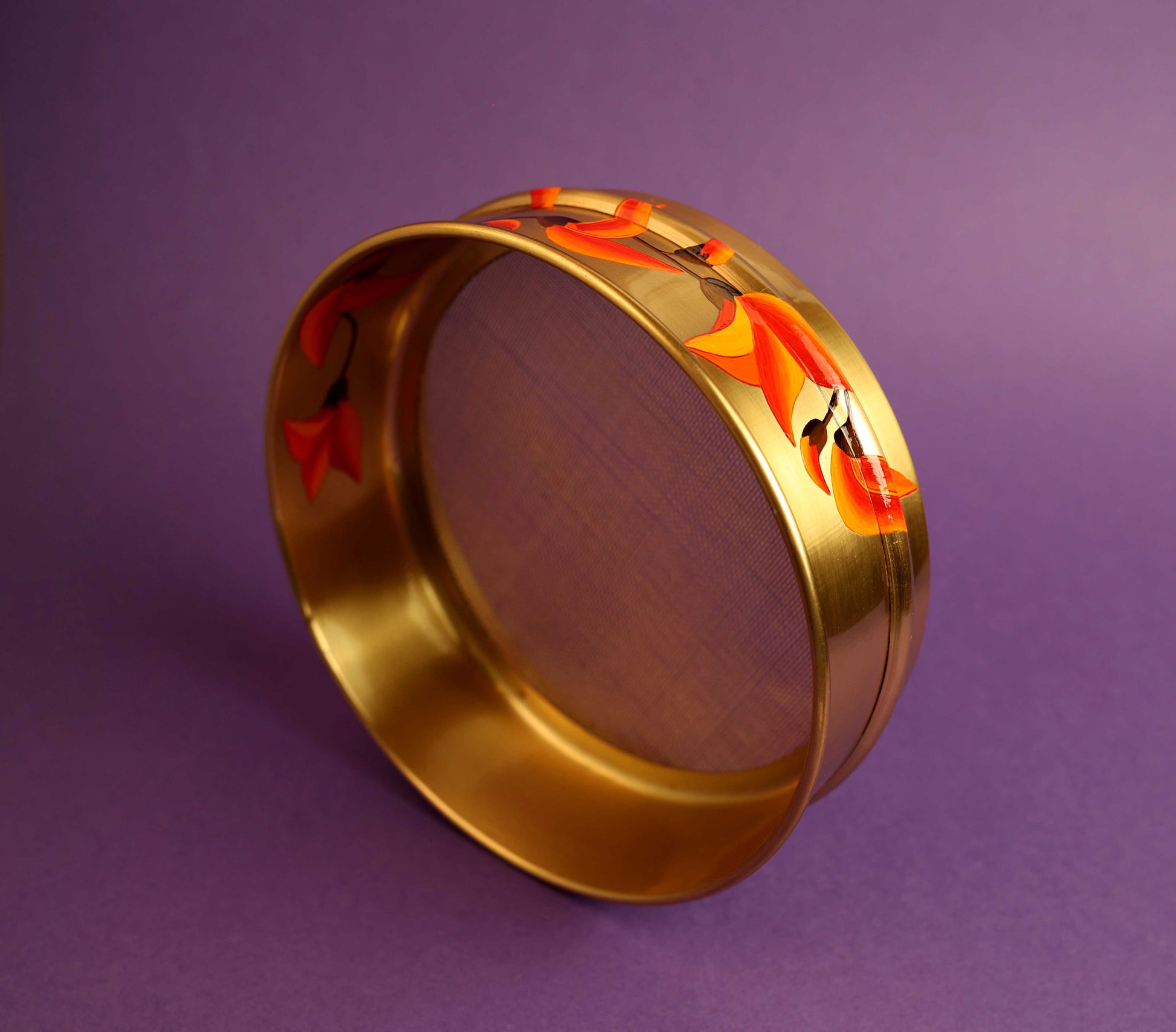 Handcrafted in pital and finished with our signature hand-painted detailing, the Padma Channi is adorned with deep red lotuses and green parrots - timeless symbols of love, fidelity, and devotion. Each piece is a small heirloom, crafted to make every Karva Chauth ritual as beautiful as the emotion it celebrates.